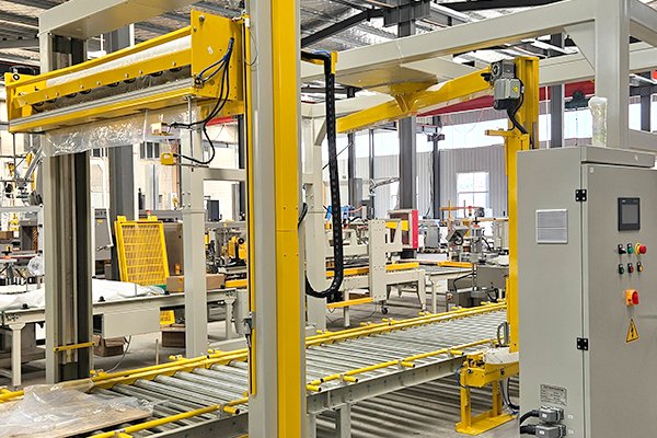 通過式覆頂膜機與搖臂式纏繞包裝機的組合,每個工序由獨立工位完成,節(jié)省了包裝時間,提高工作效率,是高效自動化產(chǎn)線的不二選擇。該套線體還可以配自動托盤貼標機和自動標簽打印機,實現(xiàn)混產(chǎn)線體的即貼即打。