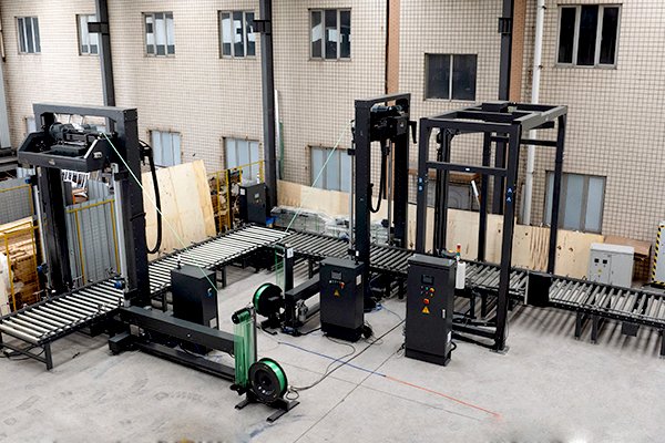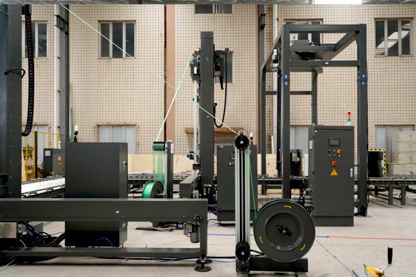 瓦楞紙板捆扎纏繞包裝線2臺(tái)頂壓式托盤穿劍捆扎機(jī)、1臺(tái)搖臂式纏繞包裝機(jī)以及若干滾筒輸送機(jī)組成。針對(duì)瓦楞紙板比較蓬松的特性,該線體配備了帶下壓功能的托盤捆扎機(jī),最大壓力可達(dá)500kg,有效降低包裝體積,同時(shí)讓包裝物更加緊實(shí),防止運(yùn)輸過(guò)程中的散落。