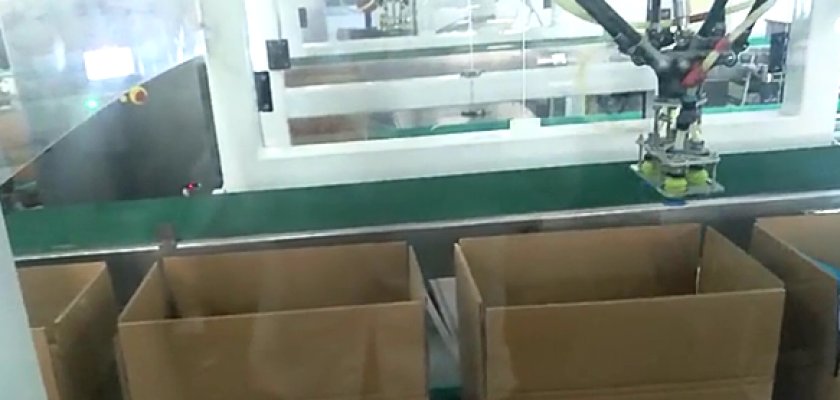 并聯(lián)機器人裝箱機也稱蜘蛛手裝箱機,是一款速度比較快的裝箱機,該機采用PLC控制,配合自動機械手(抓手樣式可選),實現(xiàn)對小物品的自動裝箱作業(yè),主要用于小袋產(chǎn)品或小盒產(chǎn)品的的裝箱,多用于食品、藥品、化工等包裝領(lǐng)域。